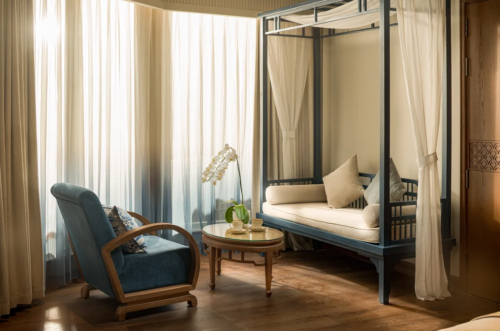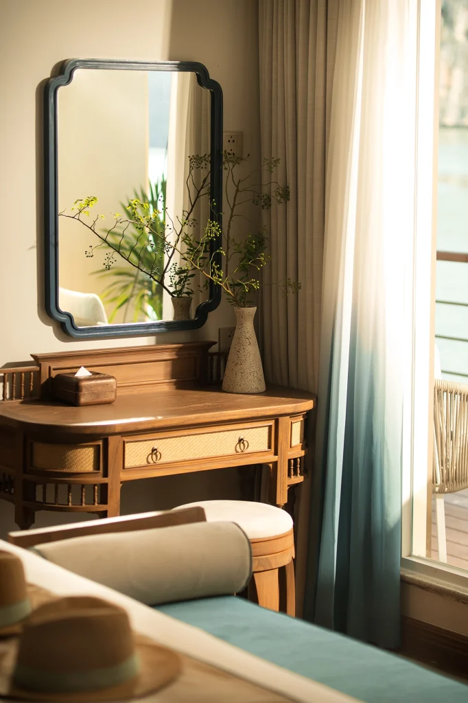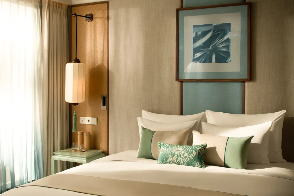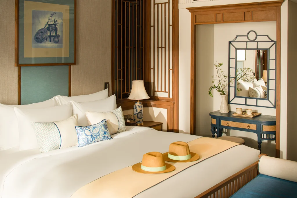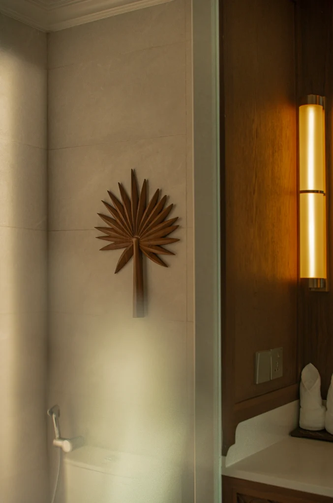 Inspired by nature’s symphony: the Voice of the Bay, the Signature Suite embodies harmony between art and the natural world. Hand-painted watercolor textiles evoke the gentle rhythm of the sea and forest, while a grand private balcony with sun loungers invites you to unwind amid the serene whispers of Halong Bay.