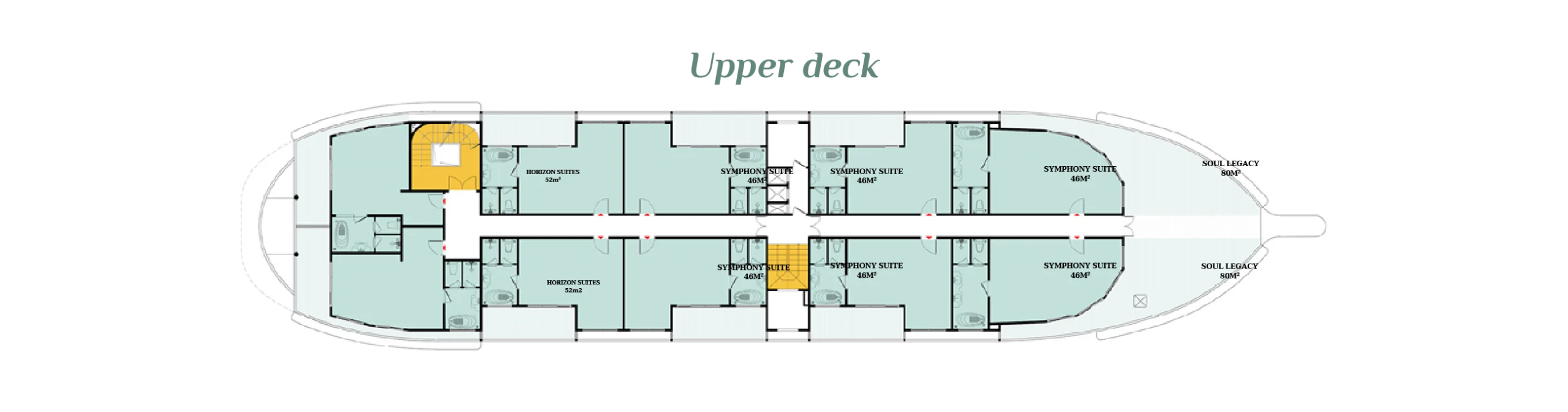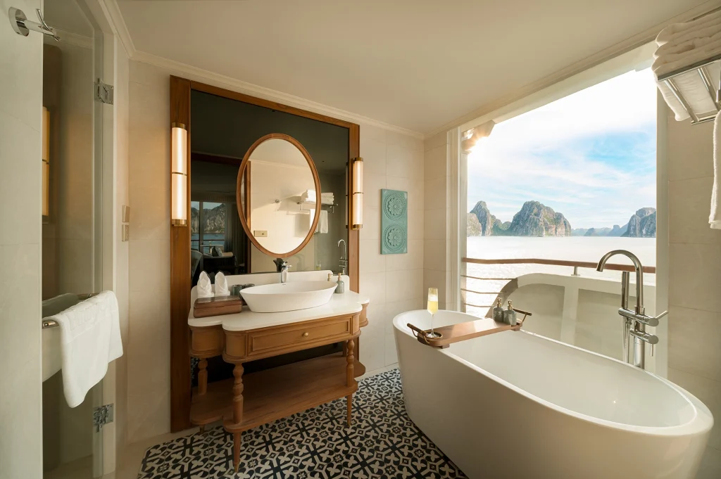Located in the foremost position at the bow of the second deck, the Soul Legacy Suite offers one of the most privileged vantage points on the entire ship. Through its wide windows and private terrace, the bay reveals itself like a silk painting in motion – majestic limestone karsts, quiet waters, and drifting clouds composing scenes that change with the light of day.