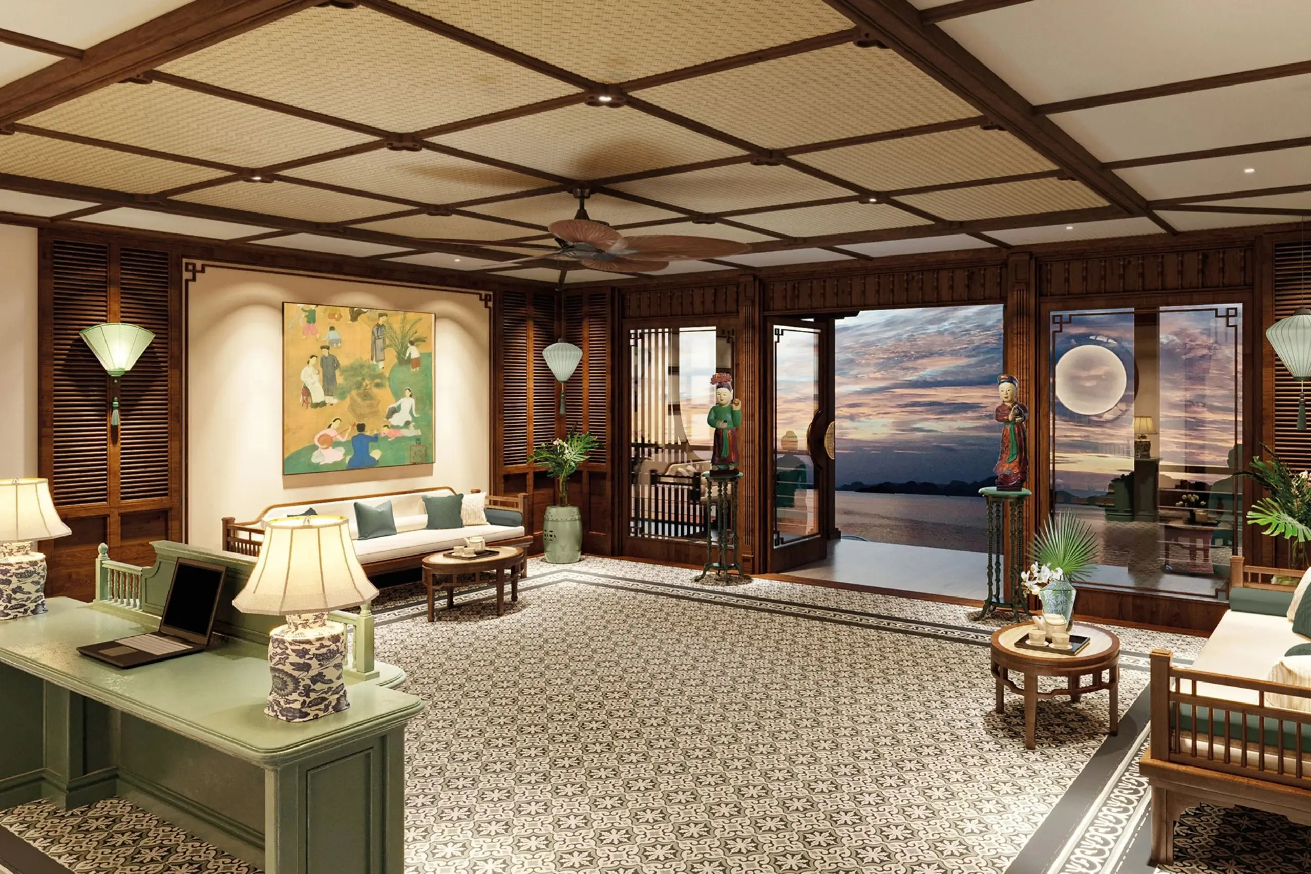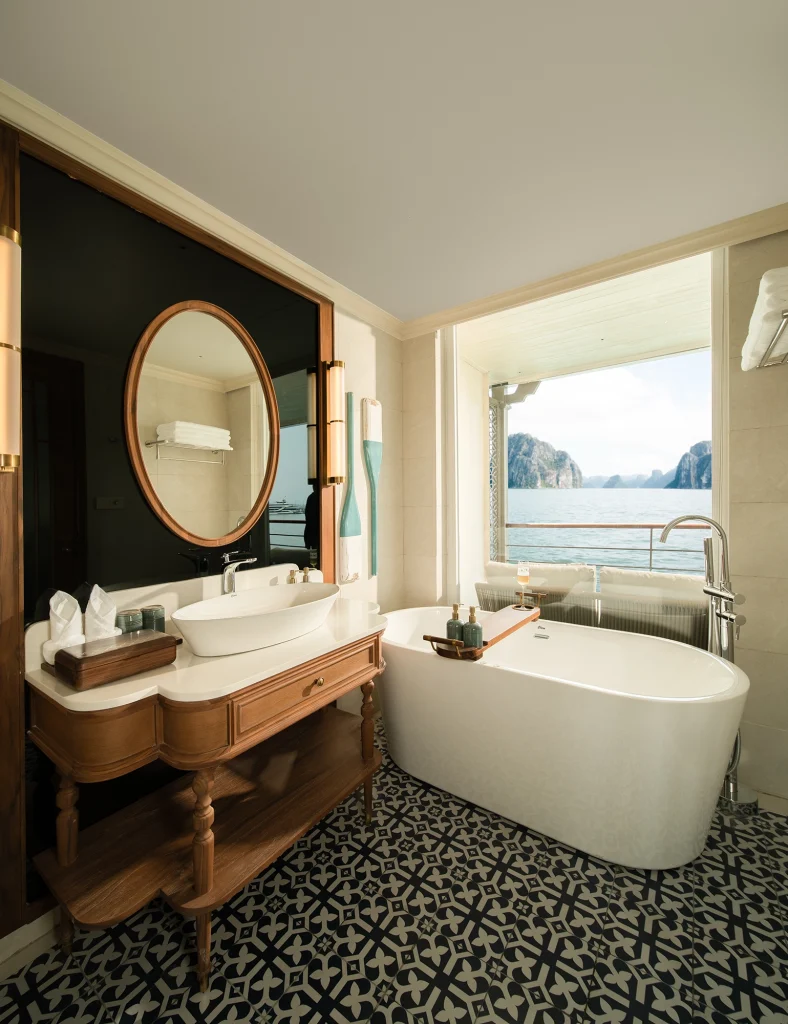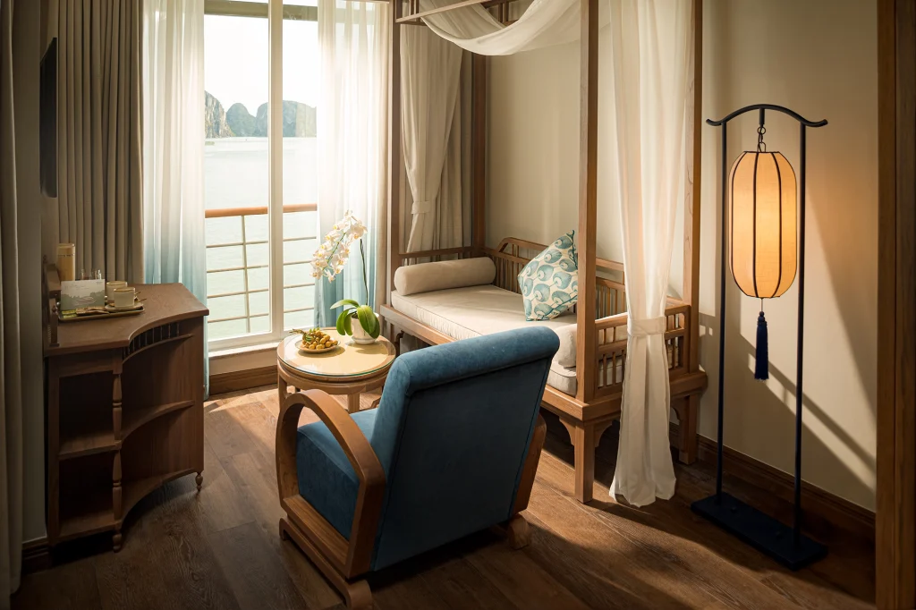 Inspired by the endless horizon, this suite is located at the stern of the ship with a spacious balcony, where the panoramic views of Halong Bay blend seamlessly with the open sky. Designed with the theme of Asian scenery, the Horizon Suite is a meeting place between craft and nature. From your own terrace viewing toward the bay’s paranoma, this is the spot to watch the sublime sunset.